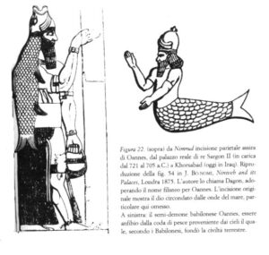 Nel primo anno …una bestia, chiamata Oannes (il Nommo ?), apparve dal mare Eritreo in un luogo adiacente Babilonia, Tutto il suo corpo era quello di un pesce, ma una testa umana gli era cresciuta sotto la testa del pesce e piedi umani gli erano cresciuti dalla coda del pesce. …Essa diede agli uomini la conoscenza delle lettere, delle scienze e delle arti di ogni tipo. Essa insegnò loro anche come fondare città, erigere Templi, formulare leggi e misurare i campi. Essa rivelò loro i semi e la raccolta di frutta ed in generale diede loro ogni cosa che è connessa con la vita civilizzata. Dal tempo di quella bestia nulla di nuovo è stato più scoperto. Ma quando il sole tramontava, questa bestia, Oannes, si tuffava nel mare e passava le notti nell’abisso, poiché essa era anfibia. In seguito altre bestie apparvero”.